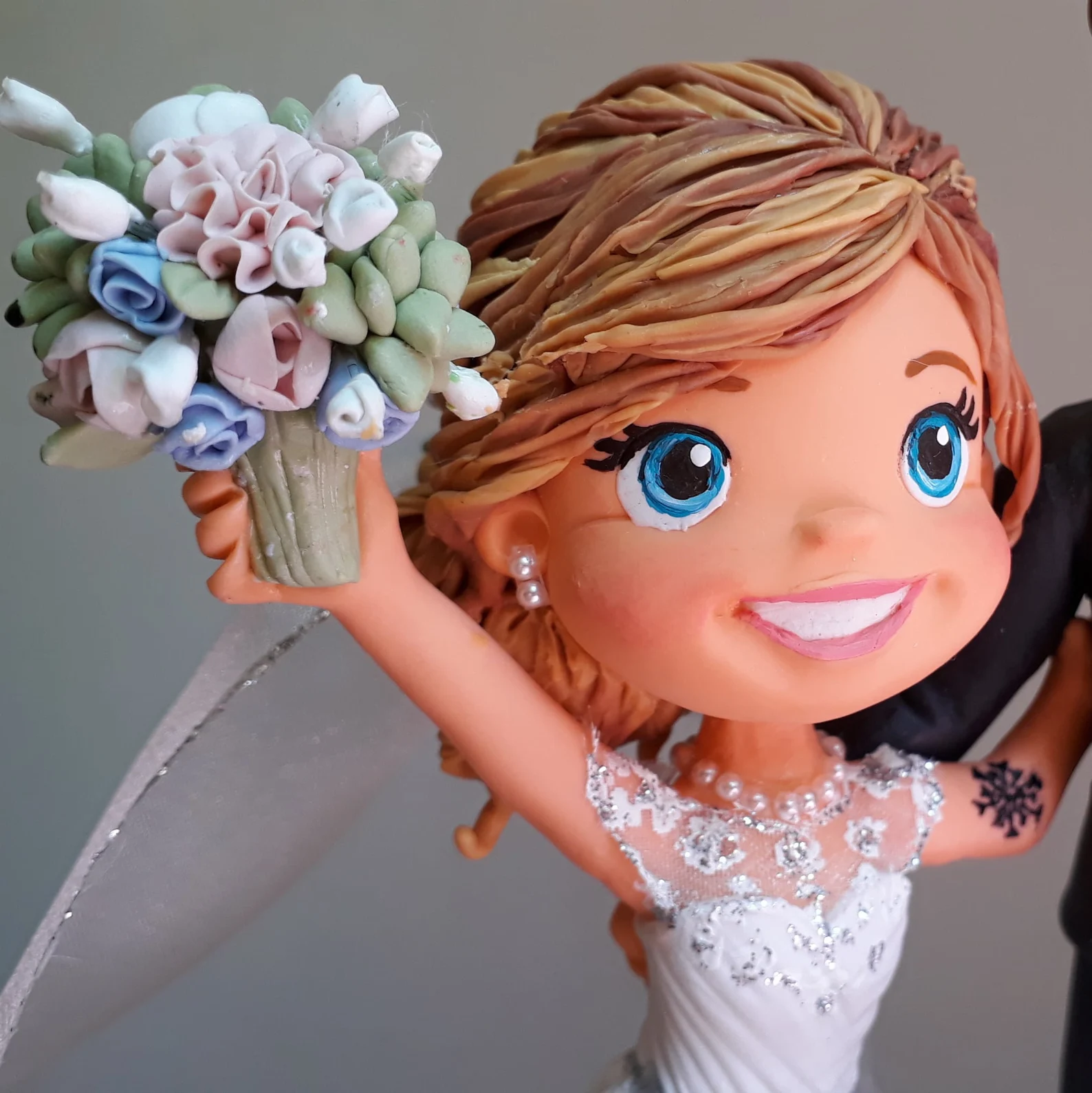 Every couple gets a custom design: skin tone, outfit, hair, pose, pets, etc. My toppers reflect the couple’s personality, hobbies or culture.